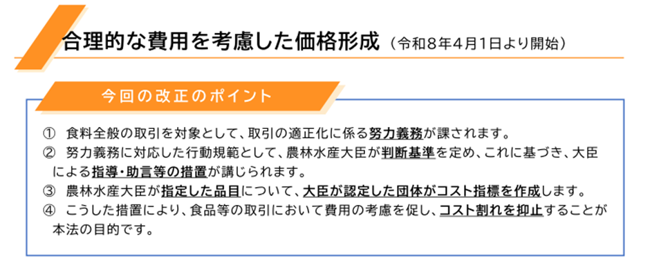 今回の改正ポイントは「合理的な費用を考慮した価格形成」なのです。努力義務なのです。食料全般の取引を対象として、取引の適正化に係る努力義務が課されます。