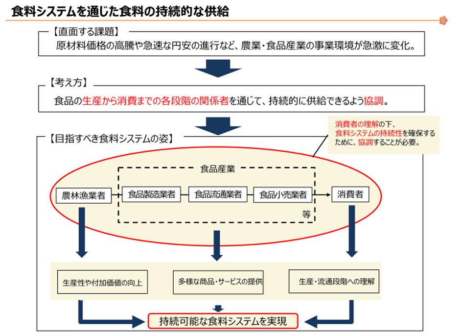 農業に限らずいろいろな製造業の方々も含めてそうです。これは農水省が作った食料システム法ですけれど、それ以外のものも考え方は、やはりそういうことが必要になってきたのかもしれないと思います。つまりコストを賄えないような価格で、お客さんが買い続けるということは、その産業が我が国からなくなるということを意味するわけです。