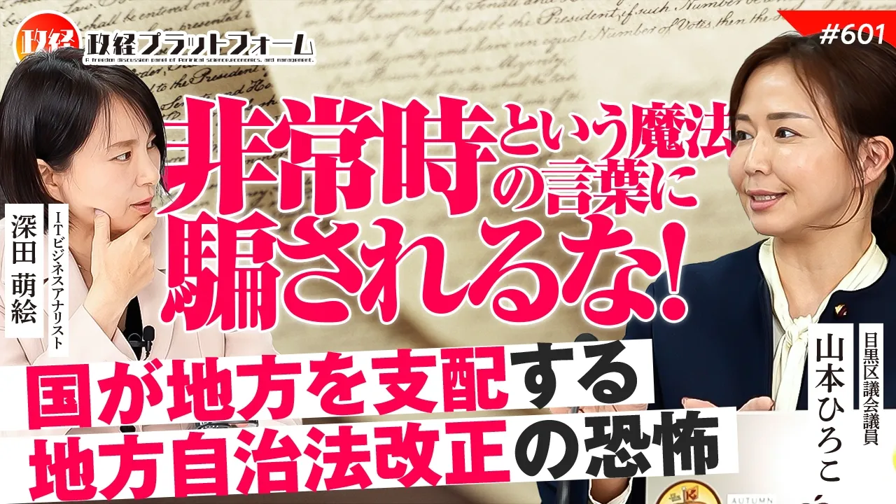 「非常時」という魔法の言葉に騙されるな!国が地方を支配する、思考停止の地方自治法改正の恐怖 山本ひろこ氏 #601 公開済み 2026年2月15日 · 更新済み 2026年2月15日 【ご視聴はここをクリック】 【目次】00:00 1.オープニング00:37 2.「非常時」を理由にした地方自治法改正08:11 3.曖昧な理由で強権発動、自治権停止の可能性に恐怖感