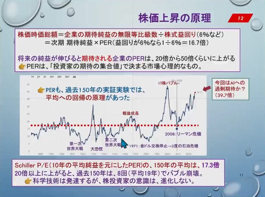 株価にいきます。株価が上がる原理は何かというと、株価時価総額というのは企業の期待純益の無限等比級数です。