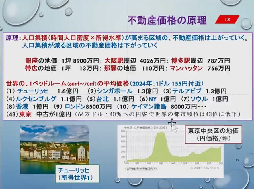 博多駅はそれよりさらに低いですよね。帯広の土地は1坪で13万円ですよね。同じ土地の広さでなぜこんなに違いがあるのかというと、これは時間人口密度×所得水準であるということですね。現在どうなっているかというと、世界のワンベッドルームの価格は1ドル155円付近とした場合、チューリッヒが一番高くて1.6億円ですね。