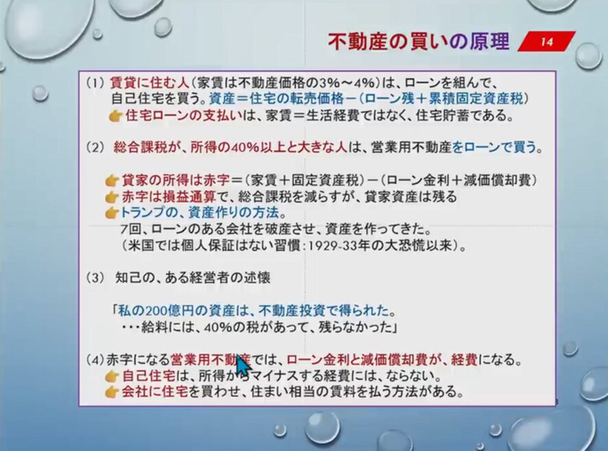 赤字になる営業用不動産では、ローン金利と減価償却費が、経費になる。自己住宅は所得からマイナスする経費にはならないけれども、会社に住宅を買わせ、住まい相当の賃料を払う方法があるということですね。