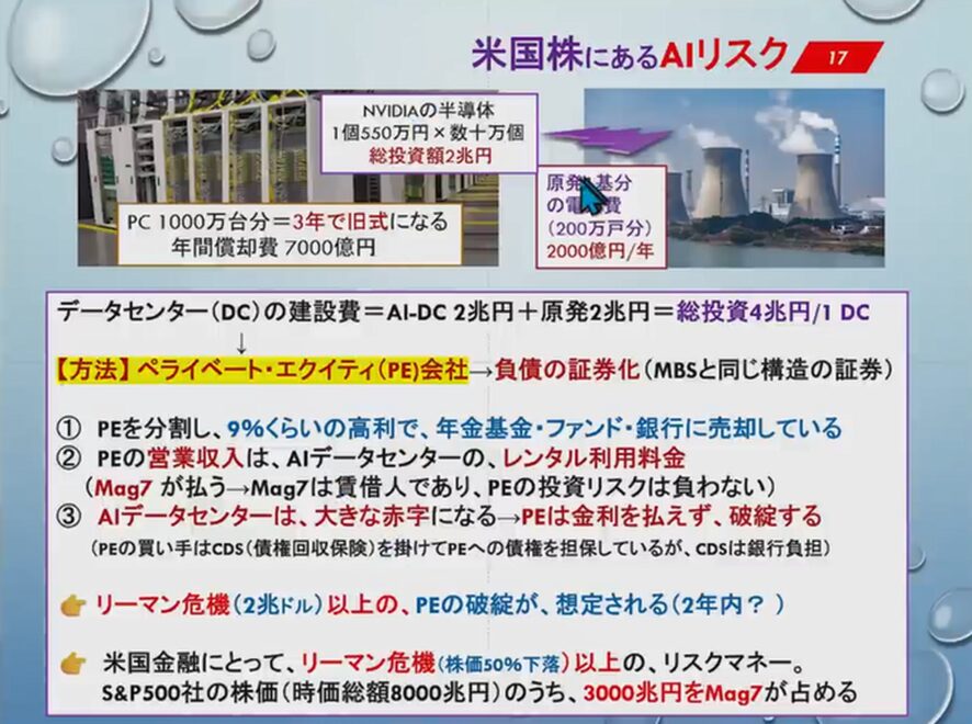 今は株高で絶好調というところなのですけれども、そろそろAI投資の加熱も覚めてくる頃で、破綻するのではないのか、そしてインパクトが非常に大きいのではないかというところが見えているのですね。
