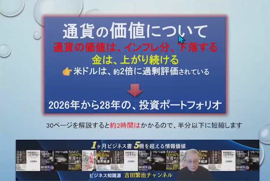 現在のドル基軸通貨体制というのは何かと言いますと、世界の通貨として貿易にはドルを使うということなのですよね。そういうことから海外からドル需要があるわけです。そのドル需要の過剰のために、今アメリカドルは私の計算で2倍に過剰評価されています。ドル需要の過剰評価が戻るのはトランプが終わる2028年です。その間に、我々の投資ポートフォリオをどうしたらいいかということをこの中でまとめています。