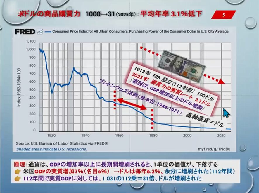 FRBは設立された1913年(大正2年)ごろから、米ドルの商品購買力について、1000ドルが今いくらの価値になっているかという統計を取っています。当時の1000ドルは今31ドルの価値で、平均年率で3.1%ずつ価値が下落してきました。1913年頃の100ドルは現在3.1ドルの価値しかないのですね。これが世界の今の通貨の中心なのです。