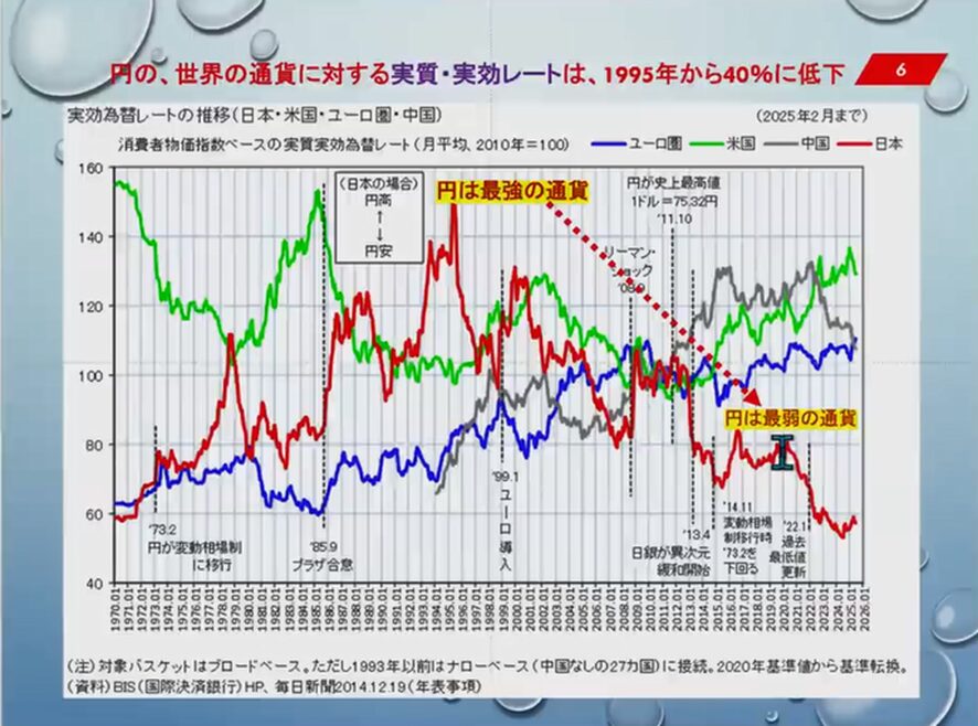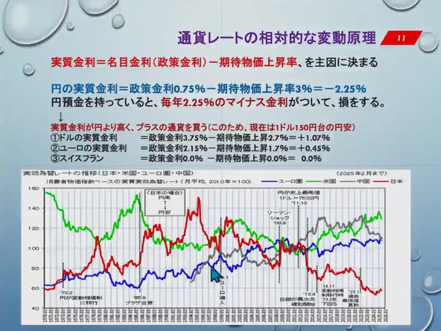 実質金利が円より高くプラスの通貨を買うために、現在は1ド150円台の円安になっている。ドルの実質金利は政策金利3.75%で期待物価上昇2.7%ですからプラス1.07%なのです。ユーロはプラス0.45%、スイスフランは0.0%ですね。結局円は売られて他の通貨が上がるという、実は今、円はトップ安なのです。
