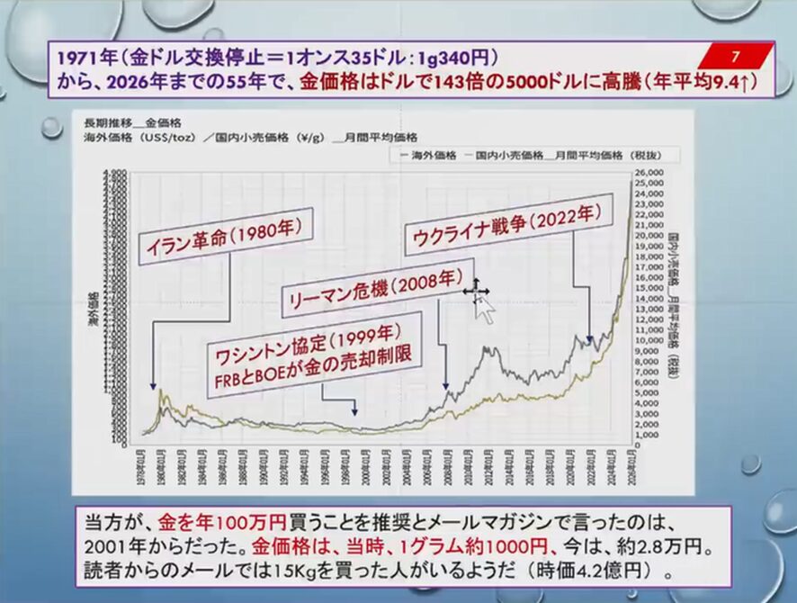 特に2022年のウクライナ戦争以降、BRICSがドル離れをして準備通貨として金を年間1000t買うようになっているわけですね。その前は500tで2倍になったのですね。供給量は3600tで変わらないからウクライナ戦争の後、高騰したわけですよね。そういうことがずっと金の歴史ですけどね。当時1g1000円だったのですよね。信じられない。今は2.8万円でしょう。28倍です。