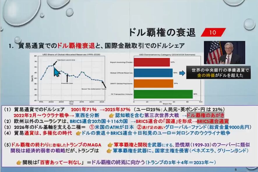 それを書いているのが世界の貿易通貨でのドルシェアです。2001年が71%、2025年が57%です。この中でユーロが25%、人民元・英ポンド・円が合計で23%です。ウクライナ戦争は、実は東西の分断、経済と通貨を分断した戦争だったのです。