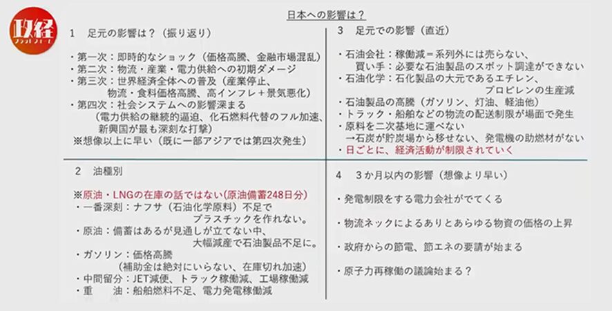 まさにそのような現象が各所で起きています。中間材の価格上昇はすでに広がっており、調べればすぐに確認できます。一方で、日本政府が一番鈍く、節電要請などは現時点でほとんど出ていません。