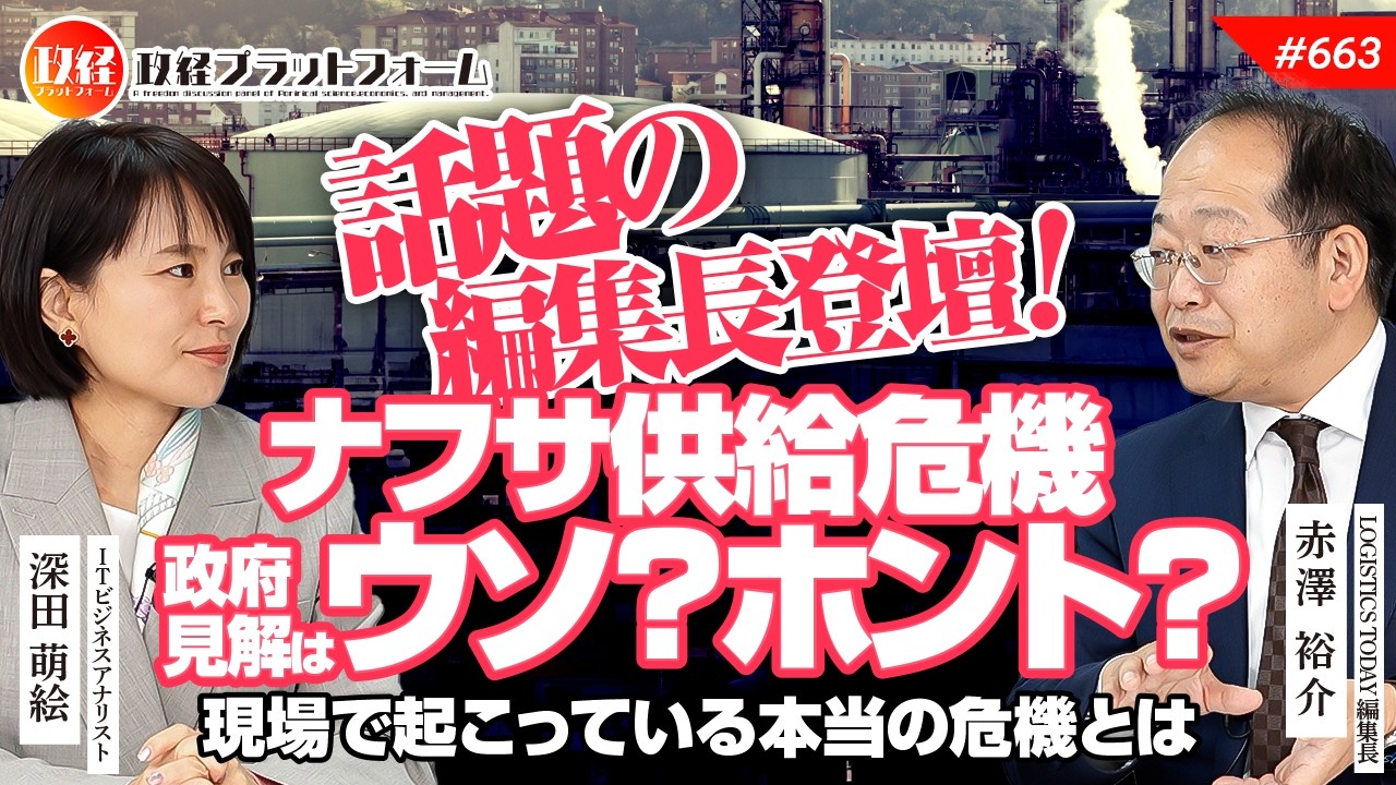 【話題の編集長登壇!】ナフサ供給危機 政府見解はウソ?ホント? 現場で起こっている本当の危機とは 赤澤裕介氏 #663 公開済み 2026年4月20日 · 更新済み 2026年4月20日 【ご視聴はここをクリック】 【目次】00:00 1.オープニング00:42 2.ナフサ備蓄は2カ月分、その後の見通しは不安定化08:55 3.政府の発表と足元で起こっている状況との差異12:55 4.梱包材などの品不足が始まっている15:22 5.国産ナフサは実はたったの4%?!17:10 6.日本はアメリカ産エタンを受け入れる設備が不十分