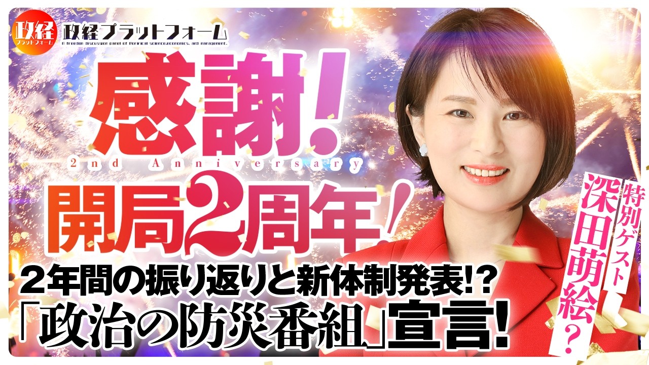 ★感謝★開局2周年!2年間の振り返りと新体制発表!?「政治の防災番組」宣言! 深田萌絵 公開済み 2026年4月23日 · 更新済み 2026年4月23日 【ご視聴はここをクリック】 【目次】00:00 01.オープニング00:27 02.開局2周年記念!AI萌絵の紹介00:54 03.政経プラットフォーム番組第一回目のゲスト03:53 04.印象深い出演ゲストの先生方07:06 05.番組をやり始めて大変だったこと08:10 06.番組をやり始めて良かったこと09:24 07.政経プラットフォーム番組の役割10:26 08.この番組でこれからやっていきたいこと11:08 09.日本をどういう国にしたい?12:13 10.視聴者の皆さんへのメッセージ